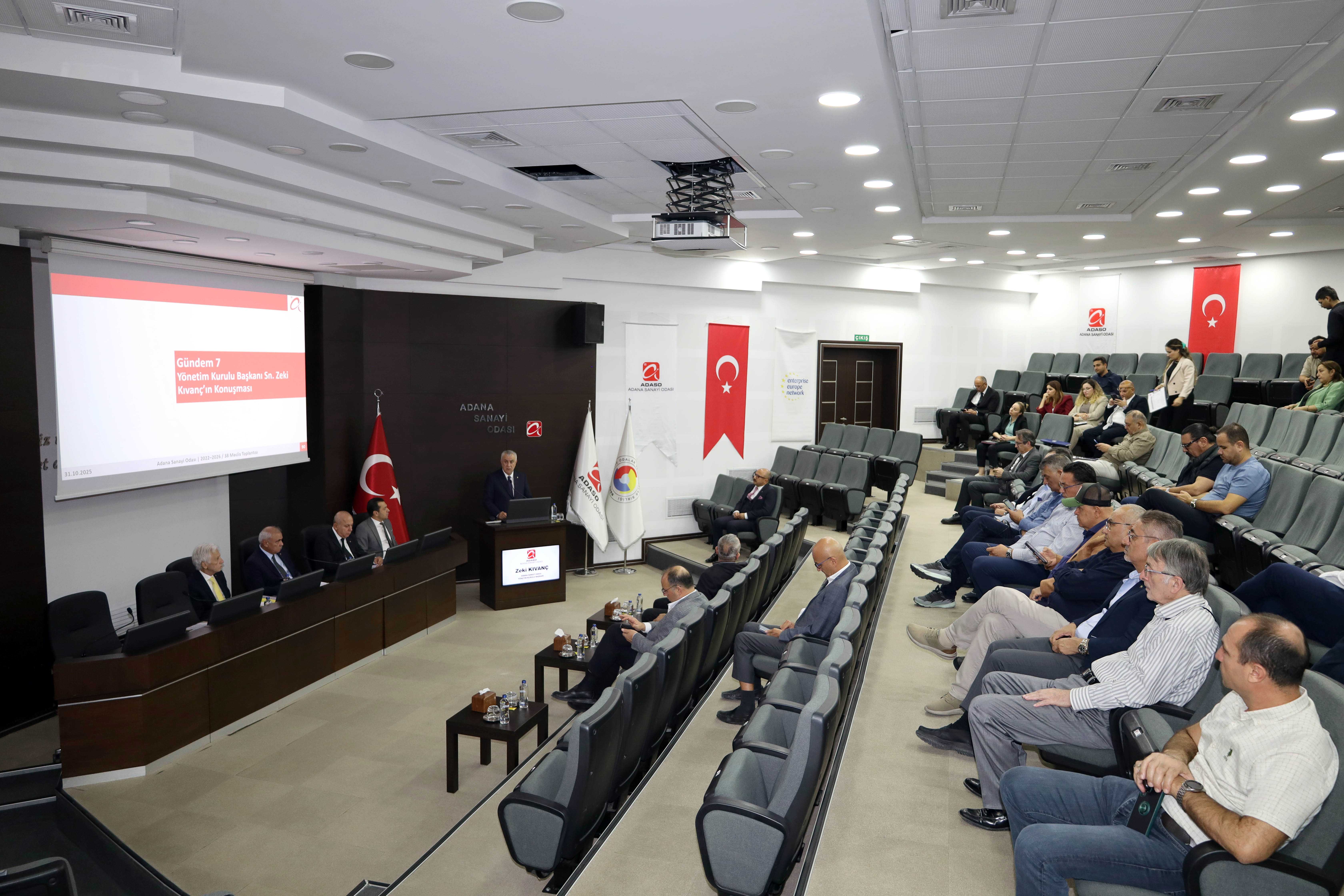 Adana Sanayi Odası Ekim Ayı Meclis Toplantısı, Meclis Başkanı İsrafil Uçurum başkanlığında gerçekleştirildi. Yönetim Kurulu Başkanı Zeki Kıvanç, toplantıda yaptığı konuşmada Ankara’da bakanlarla yapılan temasların kent sanayisine katkılarını değerlendirdi; üretim, ihracat ve yatırım gündemine ilişkin önemli mesajlar verdi.
