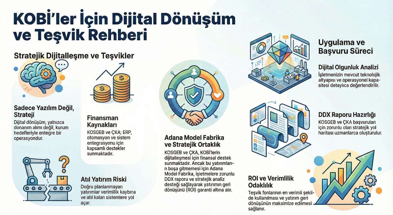 KOSGEB ve Çukurova Kalkınma Ajansı (ÇKA), KOBİ’lerin rekabet gücünü artırmak amacıyla ERP, otomasyon, üretim izleme ve sistem entegrasyonu yatırımlarına kapsamlı finansman destekleri sunmaktadır. Ancak unutulmamalıdır ki dijital dönüşüm, salt bir yazılım veya donanım satın alma süreci değil; kurum hedefleriyle entegre, stratejik bir operasyondur. Doğru planlanmayan yatırımlar, maalesef âtıl kalan sistemlere ve hedeflenen verimliliğin kaybedilmesine yol açar.