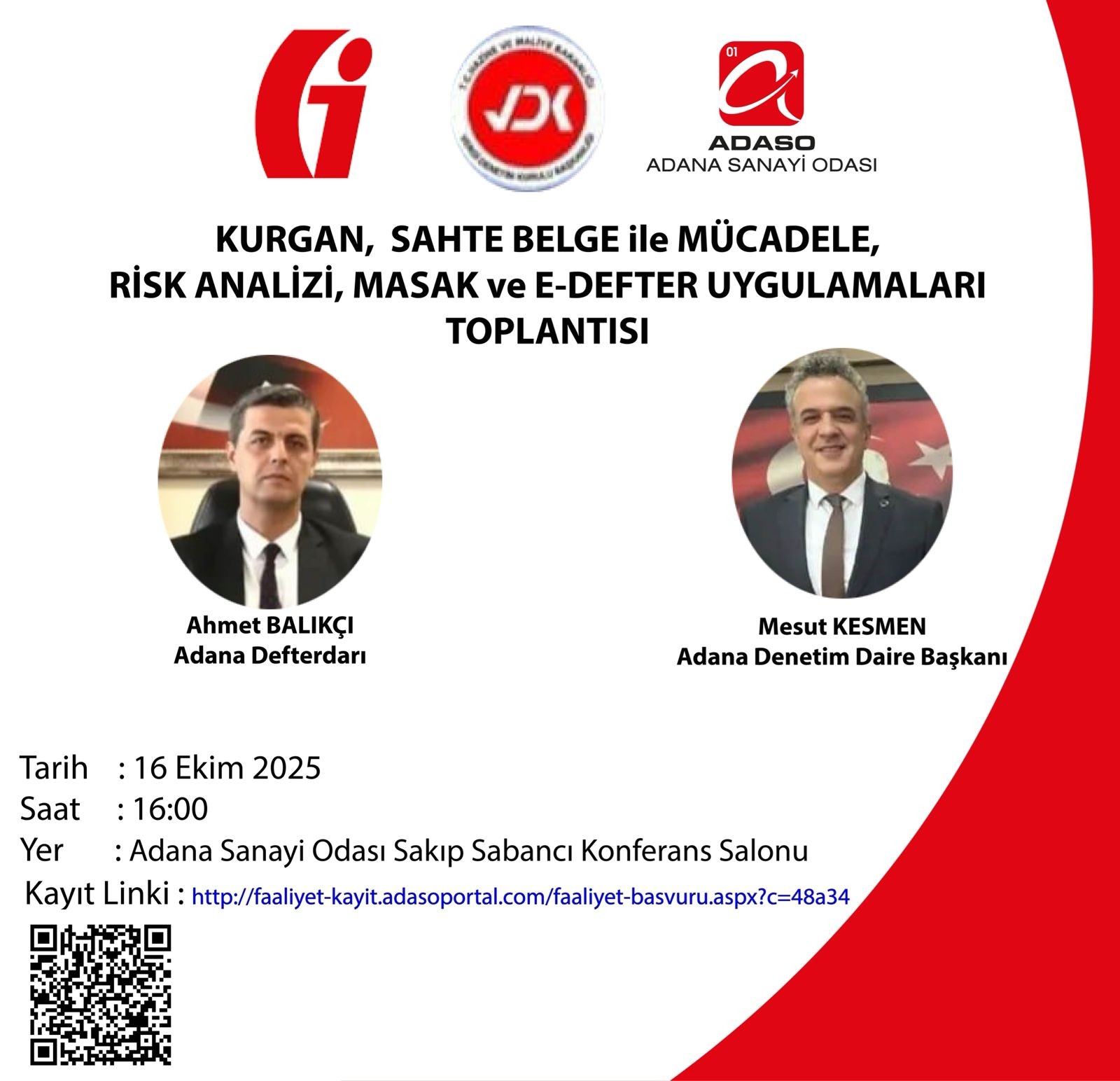 Bu kapsamda, 16 Ekim 2025 Perşembe günü saat 16:00’da Odamız ev sahipliğinde Adana Defterdarı Sayın Ahmet BALIKCI ve Adana Denetim Daire Başkanı Sayın Mesut KESMEN’in katılımlarıyla KURGAN Sahte Belge ile Mücadele, Risk Analizi, MASAK ve E-Defter Uygulamaları Hakkında Bilgilendirme Semineri düzenlenecektir.