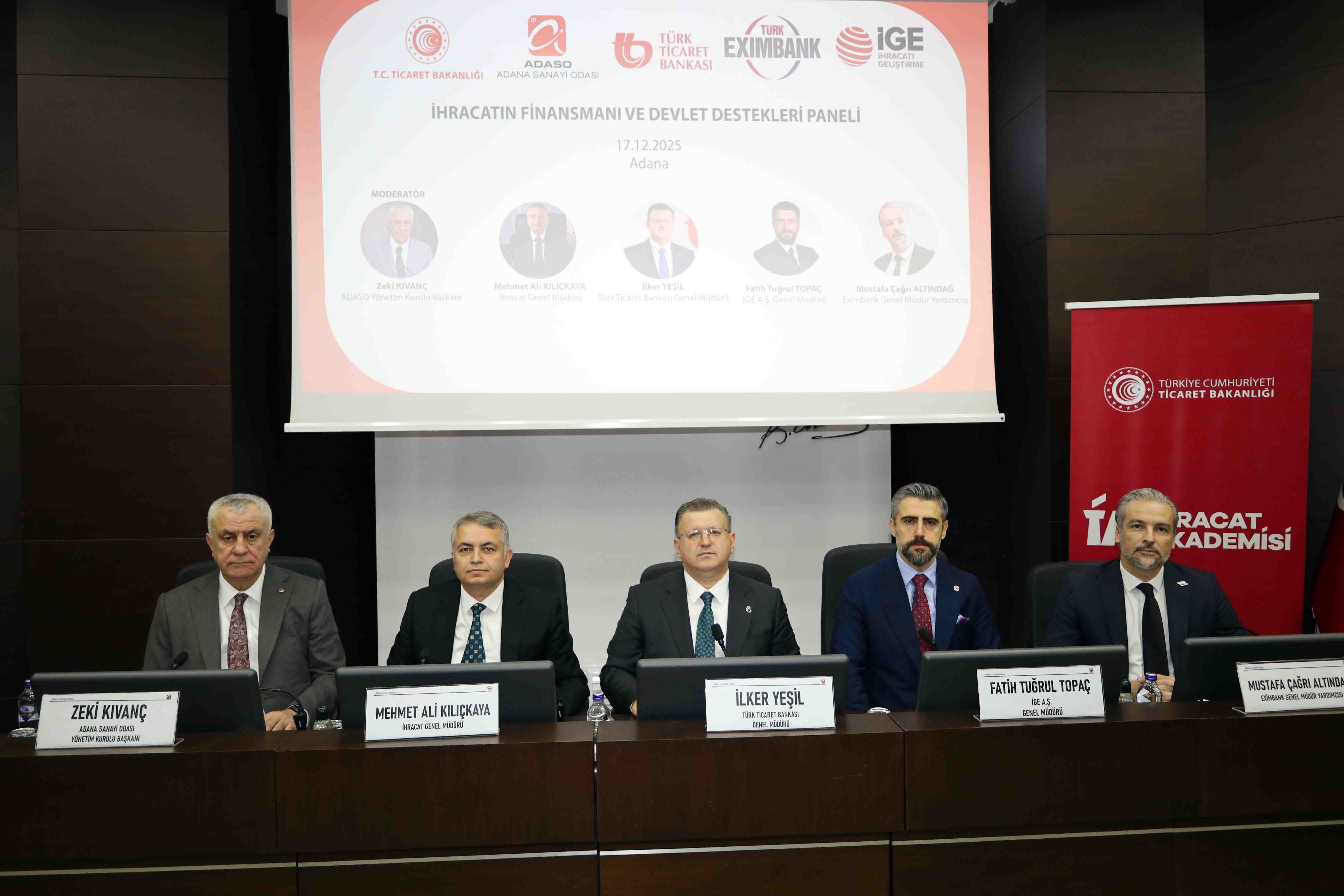 Adana Sanayi Odası (ADASO) ev sahipliğinde düzenlenen "İhracatın Finansmanı ve Devlet Destekleri Paneli", ekonomi dünyasının önemli isimlerini bir araya getirdi. Ticaret Bakanlığı, Türk Ticaret Bankası, İGE A.Ş. ve Türk Eximbank’ın üst düzey yönetiminin katılımıyla gerçekleşen panelde, ihracatçının finansman sorununa köklü çözümler ve yapay zeka destekli yeni projeler masaya yatırıldı.