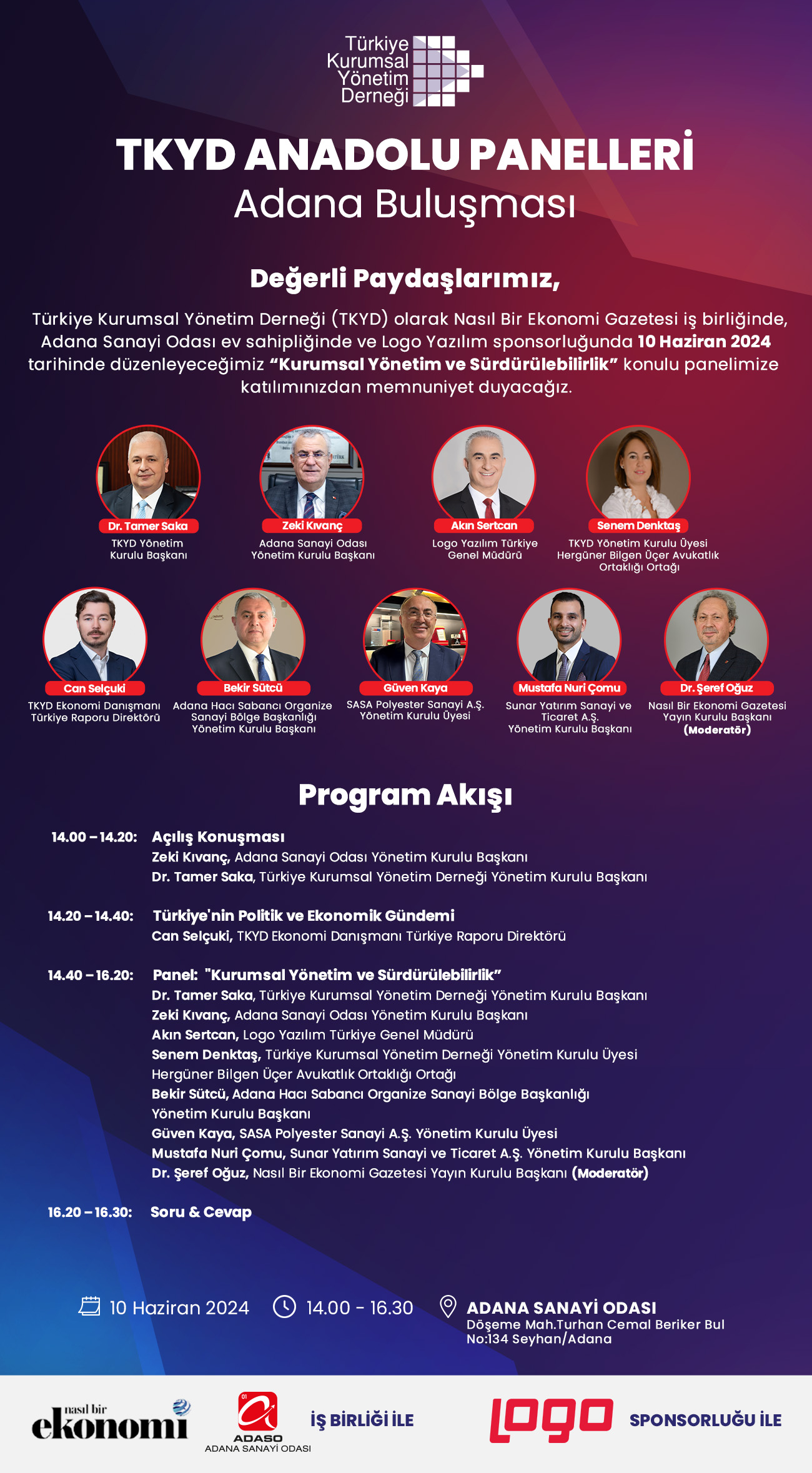 Türkiye Kurumsal Yönetim Derneği (TKYD) ve Nasıl Bir Ekonomi Gazetesi iş birliğinde, Adana Sanayi Odası ev sahipliğinde ve Logo Yazılım Sponsorluğunda 10 Haziran 2024 Pazartesi günü saat 14:00’de “Kurumsal Yönetim ve Sürdürülebilirlik” konulu panel düzenlenecektir.