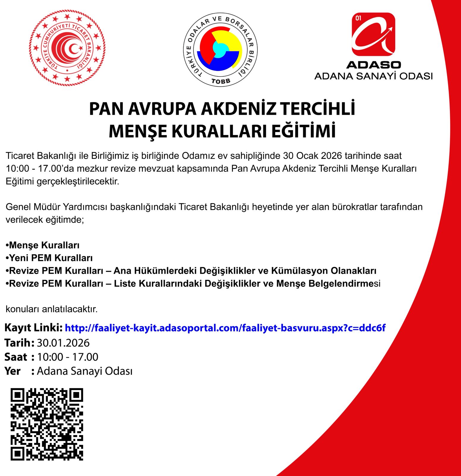 Bu kapsamda Ticaret Bakanlığı ile TOBB iş birliğinde Odamız ev sahipliğinde 30 Ocak 2026 tarihinde saat 10:00 - 17.00’da mezkur revize mevzuat kapsamında Pan Avrupa Akdeniz Tercihli Menşe Kuralları Eğitimi gerçekleştirilecektir.