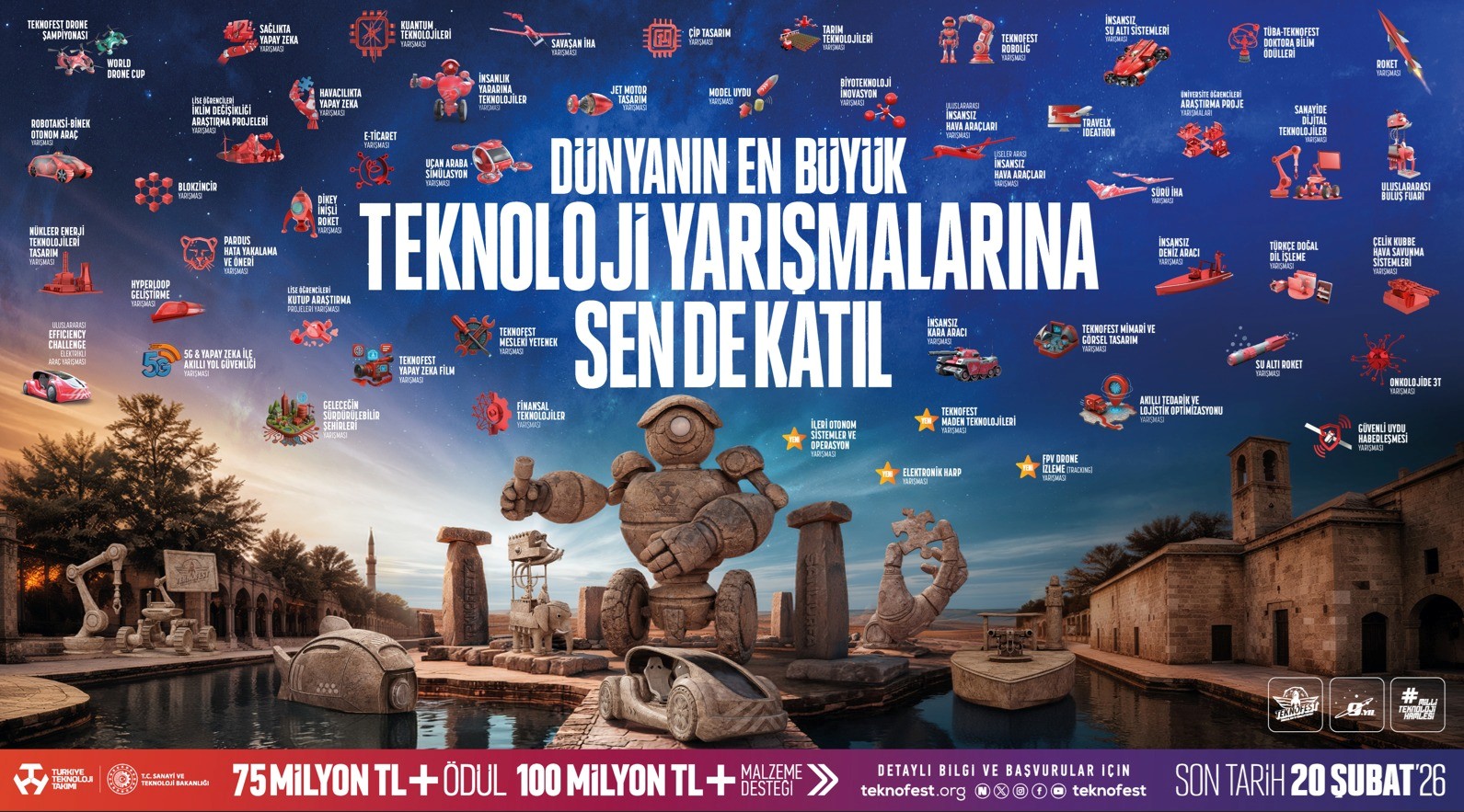 TEKNOFEST 2026’da Roket, Model Uydu, Robotaksi Binek Otonom Araç, Savaşan İHA, Çip Tasarım, TEKNOFEST Mesleki Yetenek Yarışması, BlokZincir, Hava Savunma Sistemleri, Finansal Teknolojiler, İnsansız Deniz Aracı gibi gençlerin ilgiyle takip ettiği 52 farklı teknoloji yarışması düzenlenecektir. 2025 Teknoloji Yarışmalarından farklı olarak TEKNOFEST 2026 kapsamında TEKNOFEST Maden Teknolojileri Yarışması, Elektronik Harp Yarışması, İleri Otonom Sistemler Tasarım ve Operasyon Yarışması ve FPV Drone İzleme (Tracking) Yarışması ise ilk defa başvuruya açılacaktır.