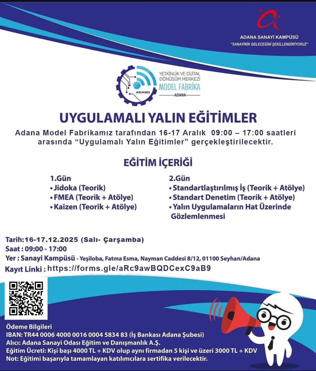 Adana Model Fabrika olarak 16-17 Aralık 2025 tarihlerinde “Uygulamalı Yalın Eğitimler” gerçekleştirilecektir.